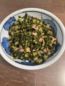 ベーコンと葉を一緒に炒め、マヨネーズとポン酢で味付け☆